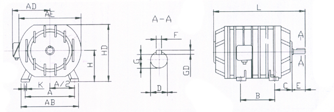 YG系列電動機安裝尺寸符合IEC標(biāo)準(zhǔn),外殼防護等級為IP54,冷卻方式為IC0041,額定電壓380V,額定功率為50Hz,H級絕緣、定子繞組采用Y接法。