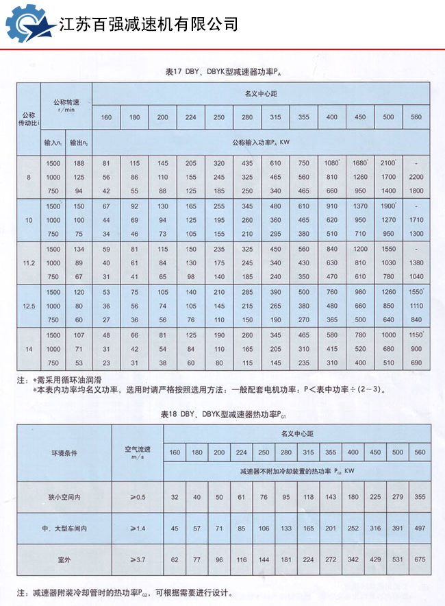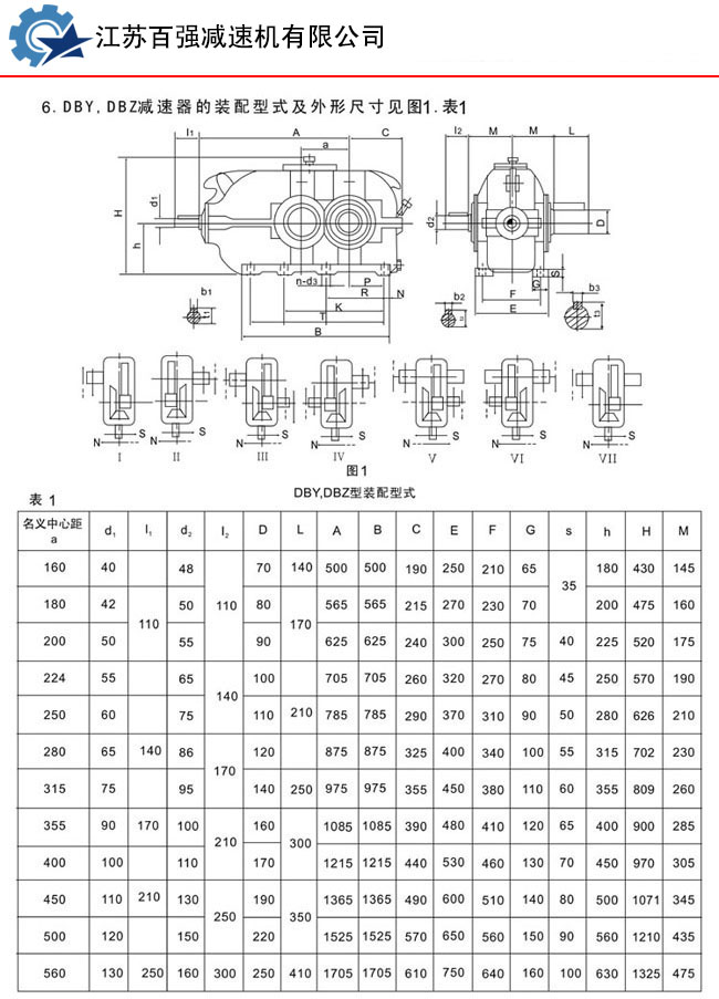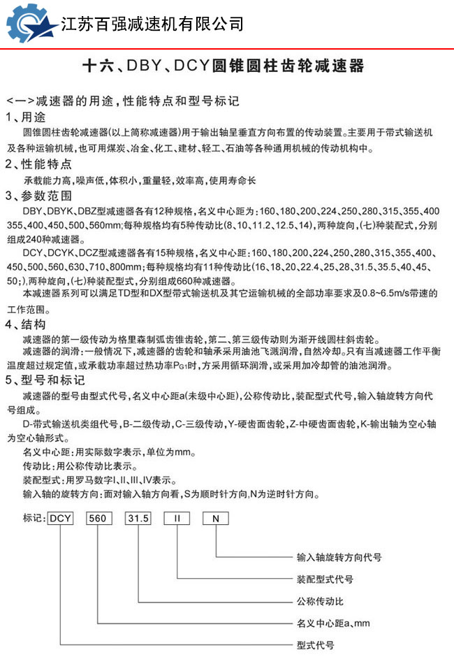 DBY、DBYK、DBZ型減速機(jī)各有12種規(guī)格,名義中心距為:160,180,200,224,250,280,315,355,400,450,500,560mm每種規(guī)格均有5種傳動(dòng)比(8,10,11.2,12.5,14)兩種旋向,四種裝配型式,分別組成240種減速機(jī)。